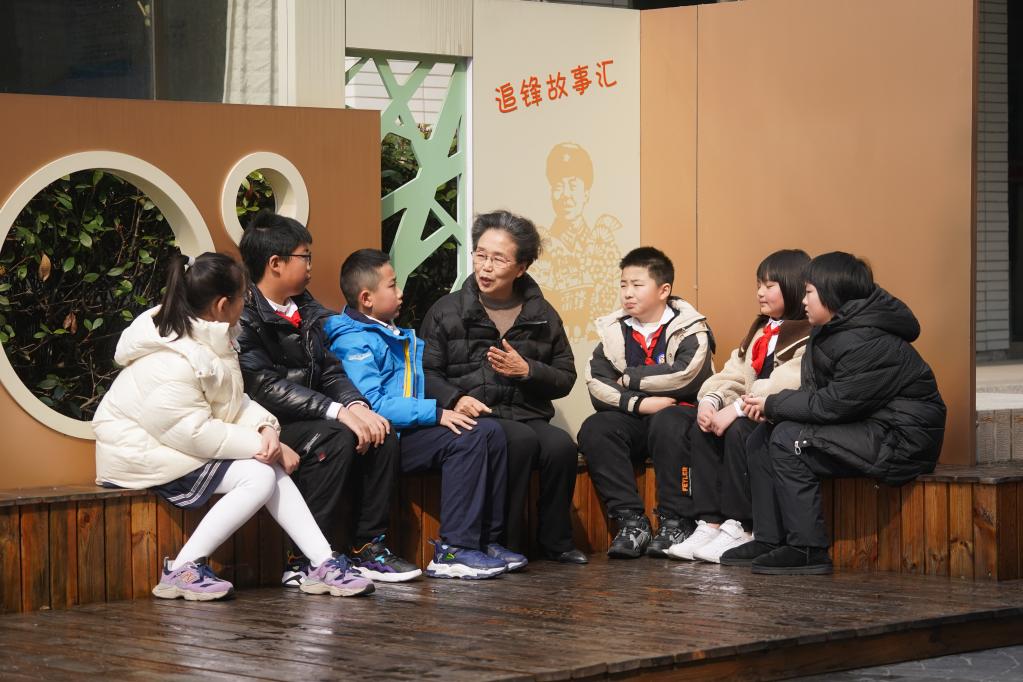 2月24日,在金沙小學(xué)校園內,榮獲“江蘇省優(yōu)秀志愿者”稱(chēng)號的五(2)雷鋒中隊老隊員王玉蘭和孩子們交流學(xué)雷鋒的日常。