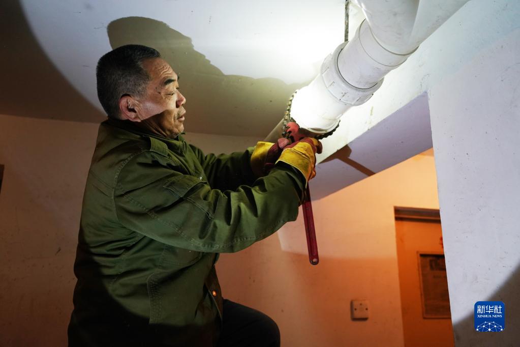 在北京市順義區旺泉街道宏城花園社區一座居民樓的地下室,殷萬(wàn)江維護污水管道(2月23日攝)。