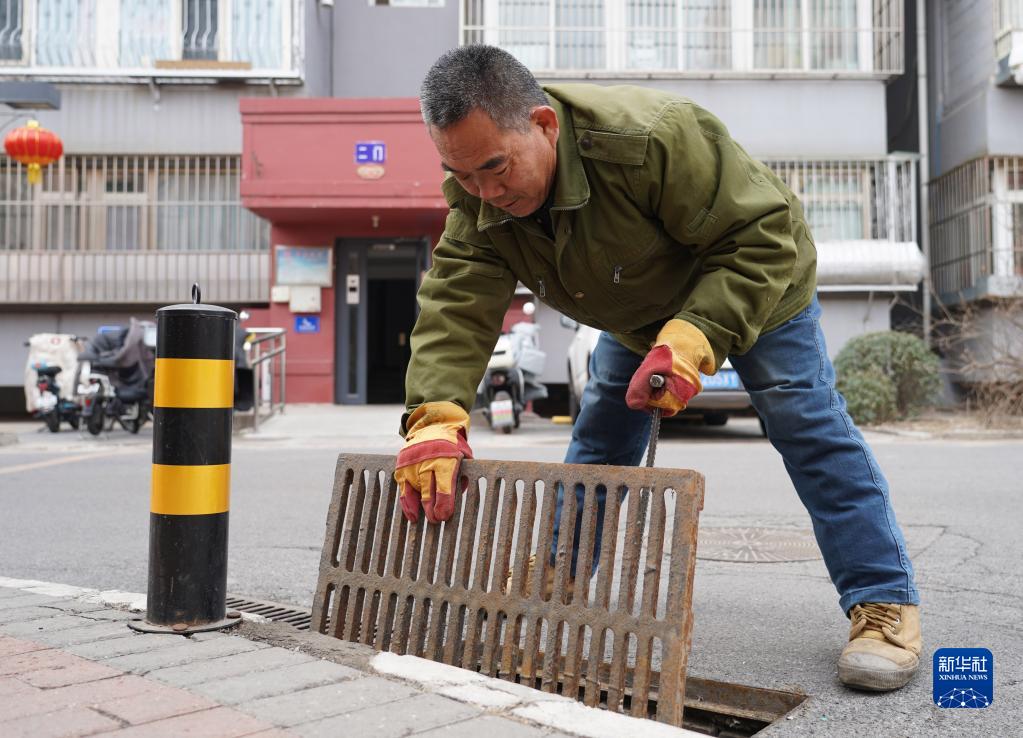 在北京市順義區旺泉街道宏城花園社區,殷萬(wàn)江巡查雨水管道(2月23日攝)。
