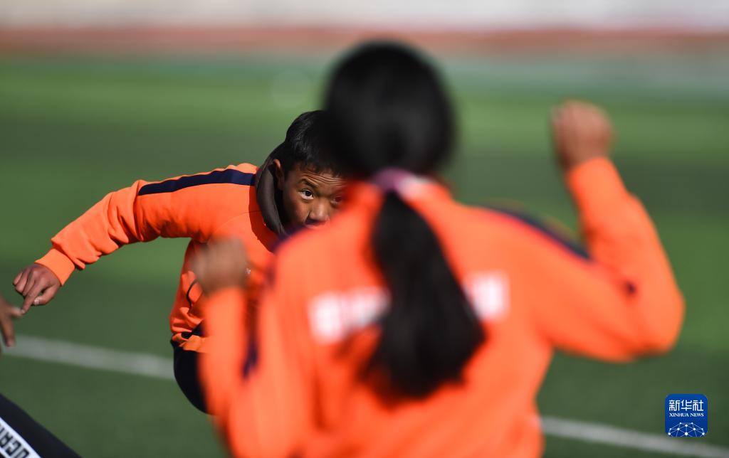 3月1日,在玉樹(shù)州曲麻萊縣第一完全小學(xué),曲麻萊青訓隊球員白瑪加(后)在訓練課中。