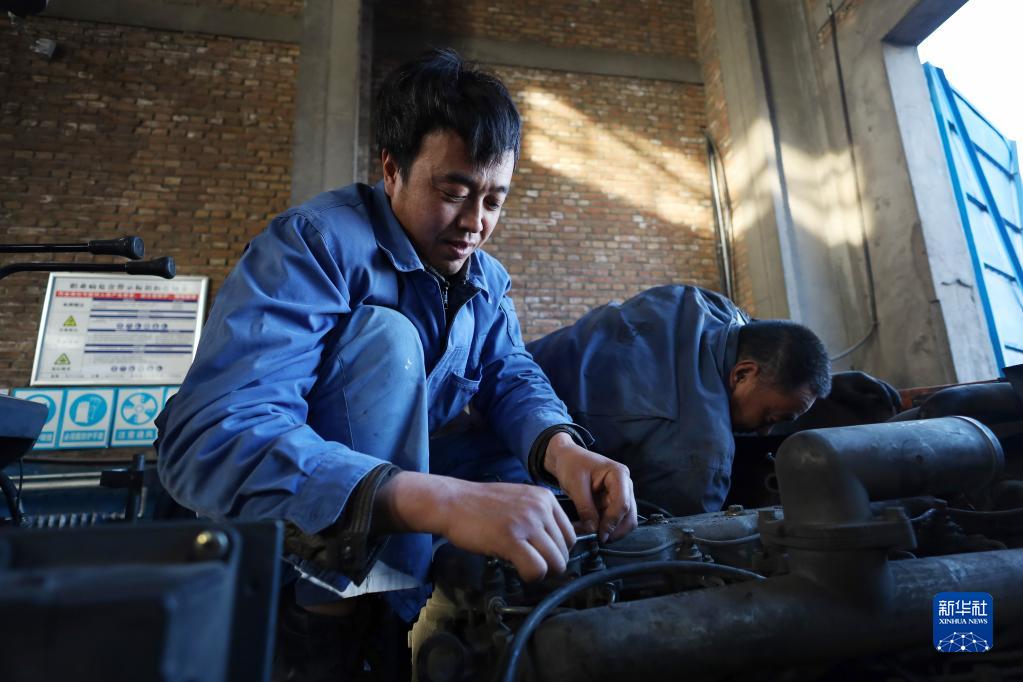 3月4日,劉富強(左)和同事在公司汽車(chē)維修車(chē)間維修車(chē)輛。