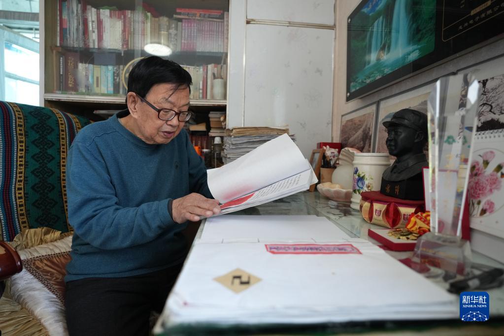 3月4日,“百姓雷鋒”姚恩亮在家中整理制作黑板報材料。