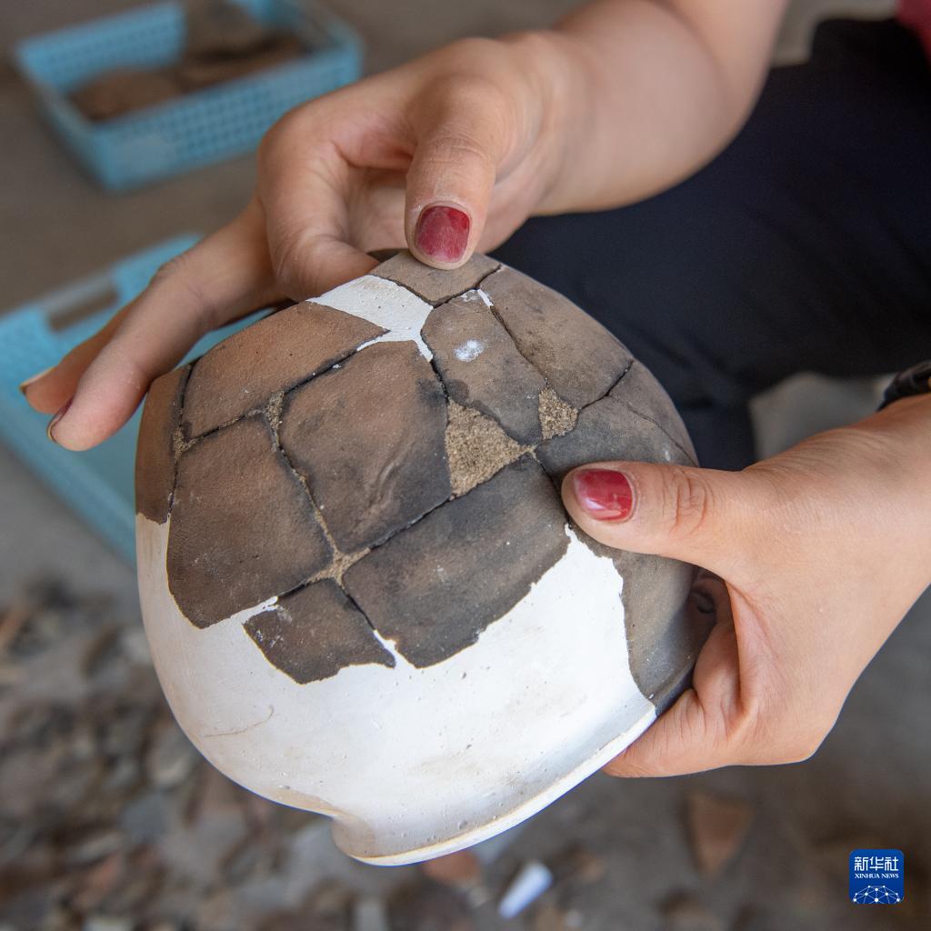 2022年10月19日,在位于重慶市涪陵區的小田溪墓群考古發(fā)掘現場(chǎng)臨時(shí)庫房?jì)?,燕妮在對一個(gè)剛完成拼對的陶器進(jìn)行初步修復。