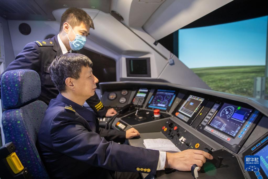 邢云堂(前)給同事演示高鐵駕駛考試要點(diǎn)(2月17日攝)。