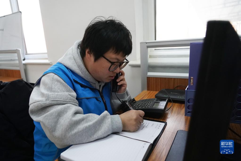 2月22日,在北京市峪口鎮西樊各莊村,王巖峰在辦公室打電話(huà)詢(xún)問(wèn)老人的生活情況。