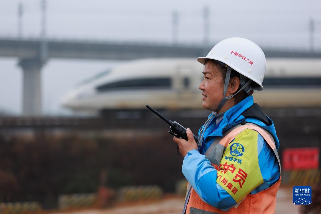 3月7日,高鐵列車(chē)經(jīng)過(guò)時(shí),中鐵八局女職工朱桂英向橋墩上的工友發(fā)出預警信息。