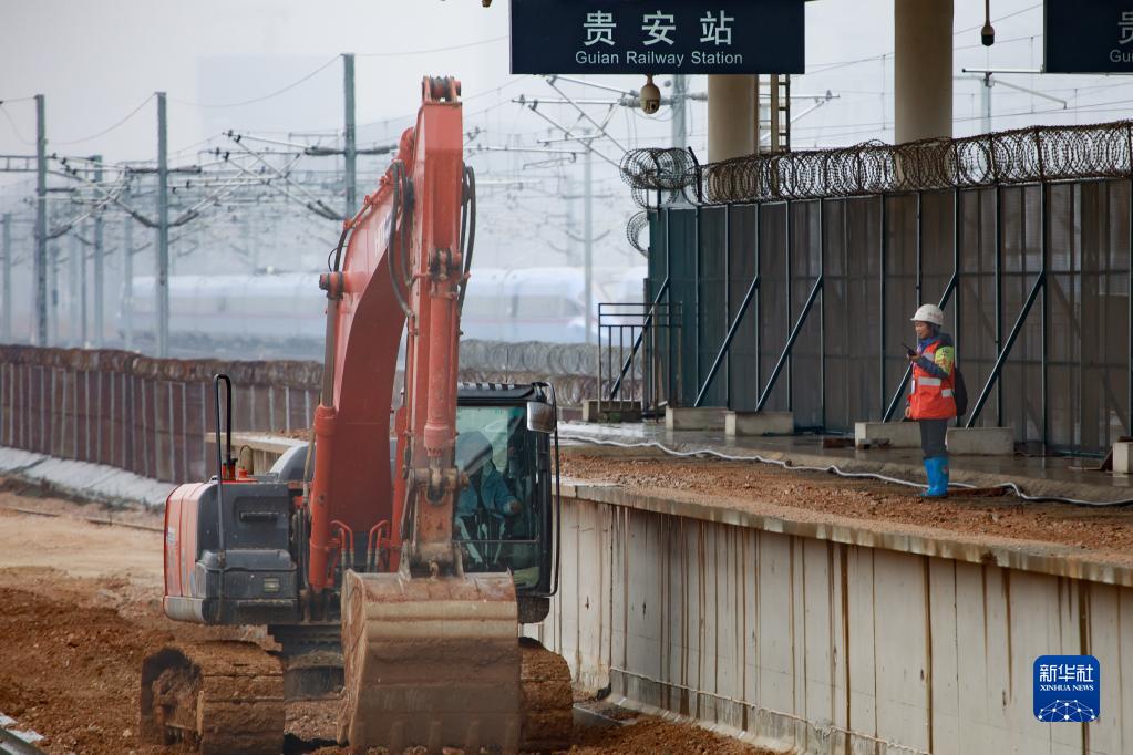 3月7日,在高鐵列車(chē)通過(guò)時(shí),中鐵八局女職工劉獻英在挖掘機旁。