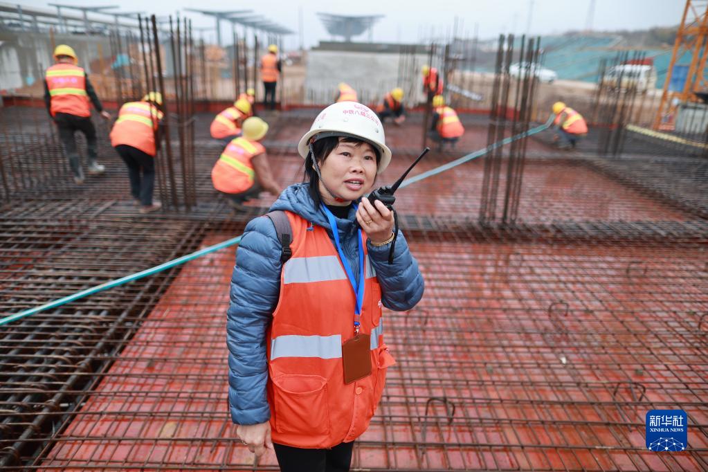 3月7日,中鐵八局女職工劉獻英在告知塔吊司機高鐵通過(guò)時(shí)間。