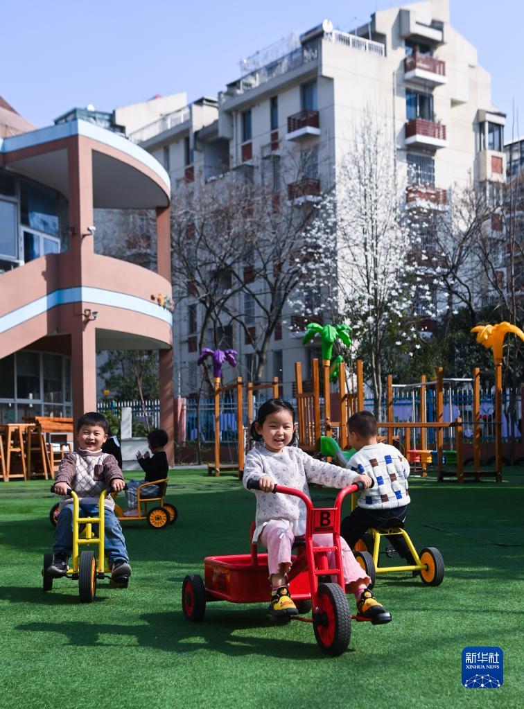 3月7日,在嘉興市南湖區桂苑社區的桂苑幼兒園內,孩子們在操場(chǎng)上玩游戲。