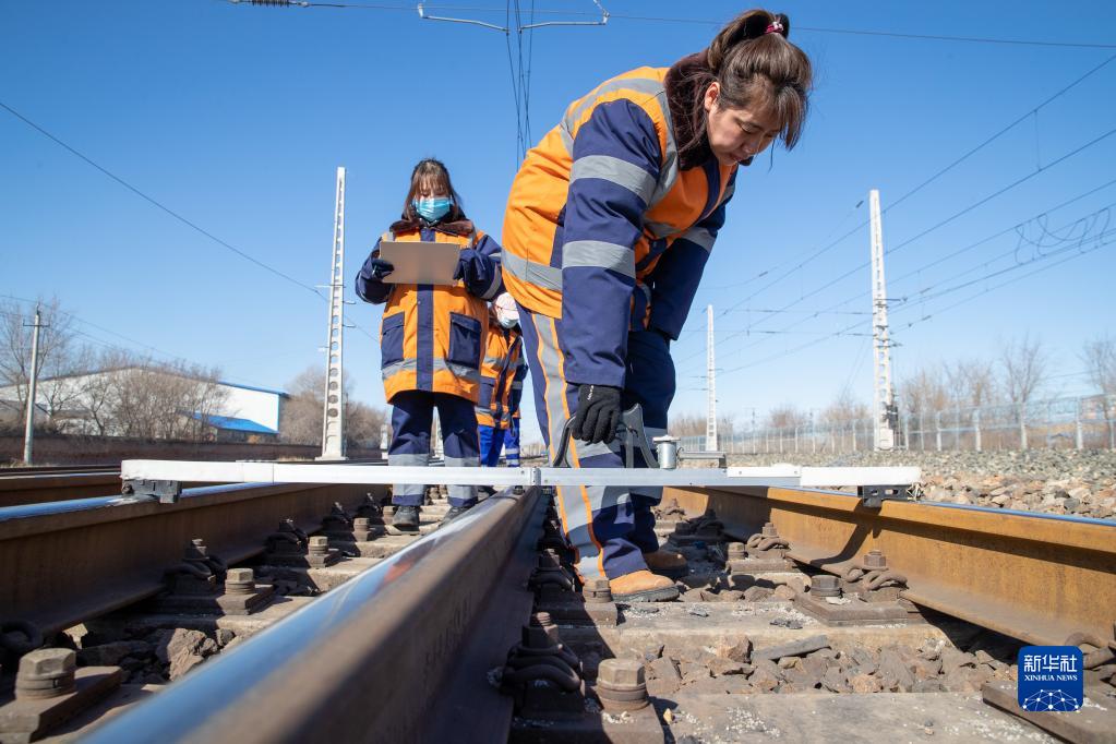 3月6日,大慶工務(wù)段杜爾伯特線(xiàn)路車(chē)間女子檢驗班班長(cháng)曹蕊在濱洲線(xiàn)199公里處作業(yè)。