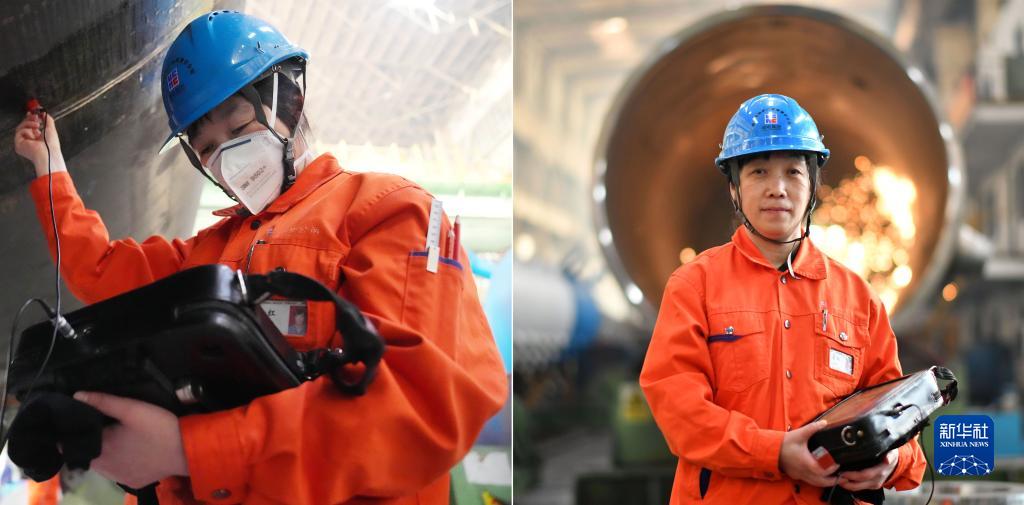 拼版照片:左圖為哈電集團哈爾濱鍋爐廠(chǎng)有限責任公司探傷工李紅在作業(yè)中;右圖為李紅在生產(chǎn)車(chē)間(3月6日攝)。
