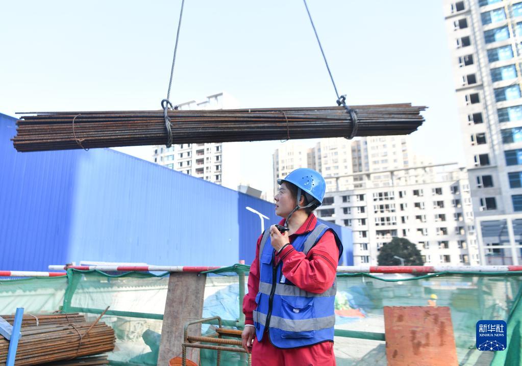 3月8日,在陜西省西安市未央區一處建筑工地,中建三局西北公司塔吊指揮張海霞在施工現場(chǎng)工作。