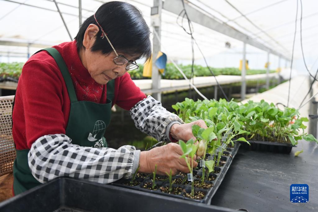 3月8日,工作人員在杭州市臨平區的杭州康成農業(yè)科技有限公司的溫室內嫁接菜苗。
