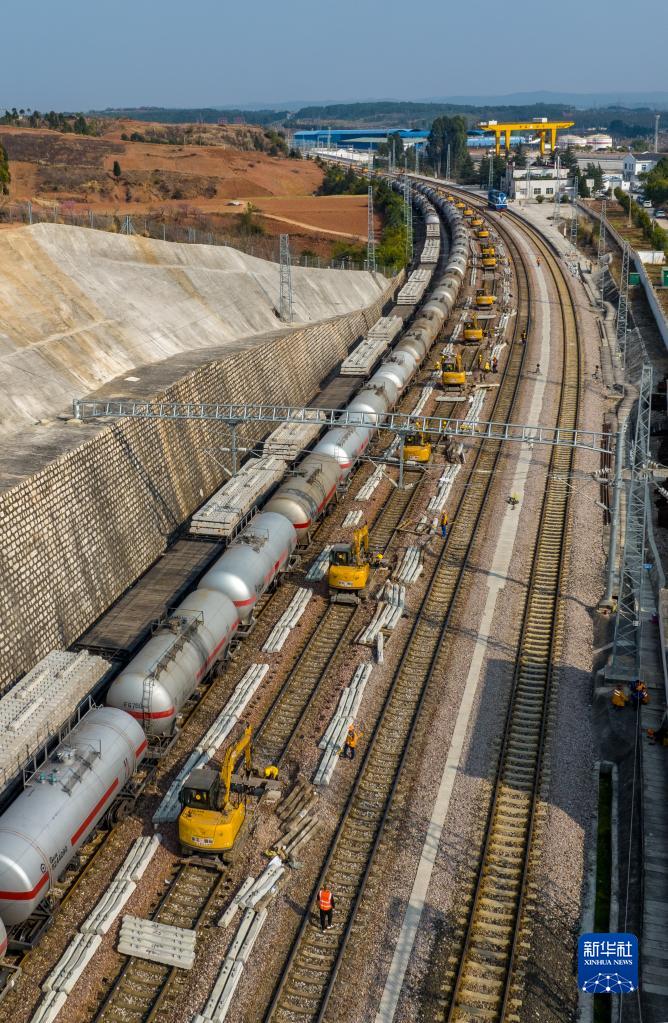 新型換枕設備在鐵路沿線(xiàn)一字排開(kāi)進(jìn)行軌枕大修(3月8日攝,無(wú)人機照片)。