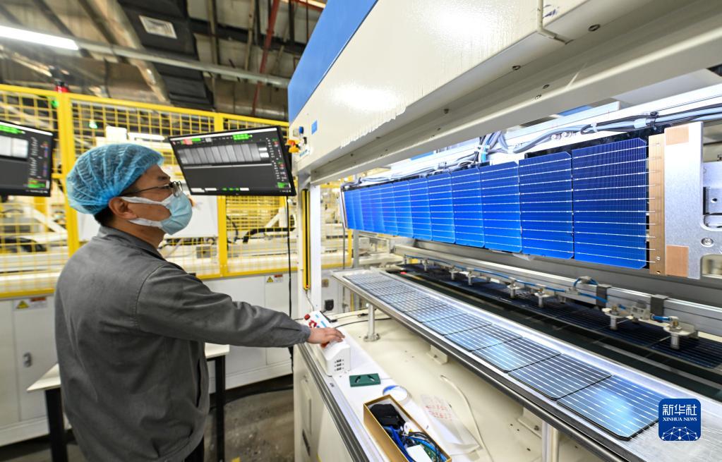 在天津一家新能源公司生產(chǎn)車(chē)間,工作人員在操作設備加工光伏組件(3月7日攝)。
