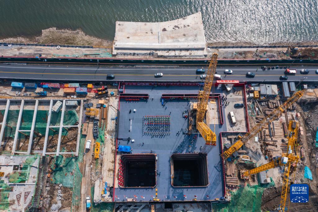 空中俯瞰富春江畔秦望通道工程過(guò)江隧道江北工作井施工現場(chǎng)(3月9日攝,無(wú)人機照片)。