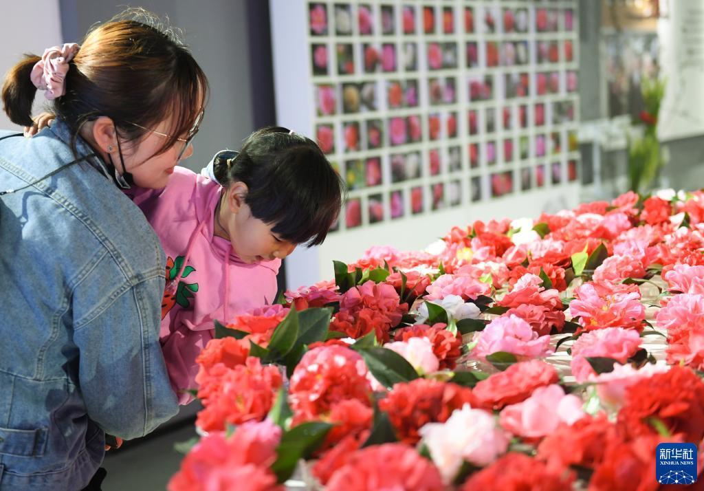 3月10日,在金華市婺城區竹馬鄉的茶花展上,家長(cháng)帶著(zhù)小朋友觀(guān)賞茶花。