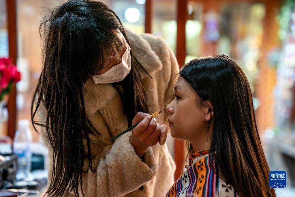 3月8日,游客(右)在獨克宗古城里的一家藏裝店化妝。