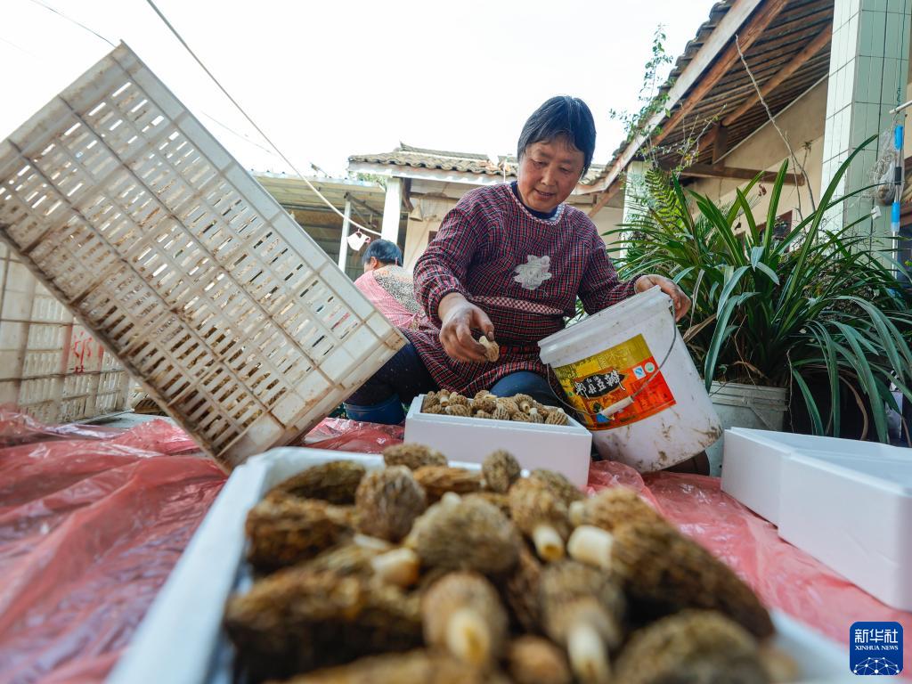 在四川省成都市大邑縣新場(chǎng)古鎮燈籠社區,村民在整理剛采摘的羊肚菌(3月8日攝)。