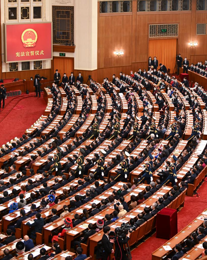 3月10日,十四屆全國人大一次會(huì )議在北京人民大會(huì )堂舉行第三次全體會(huì )議。全體會(huì )議各項議程進(jìn)行完畢后,舉行中華人民共和國第十四屆全國人民代表大會(huì )第一次會(huì )議憲法宣誓儀式。