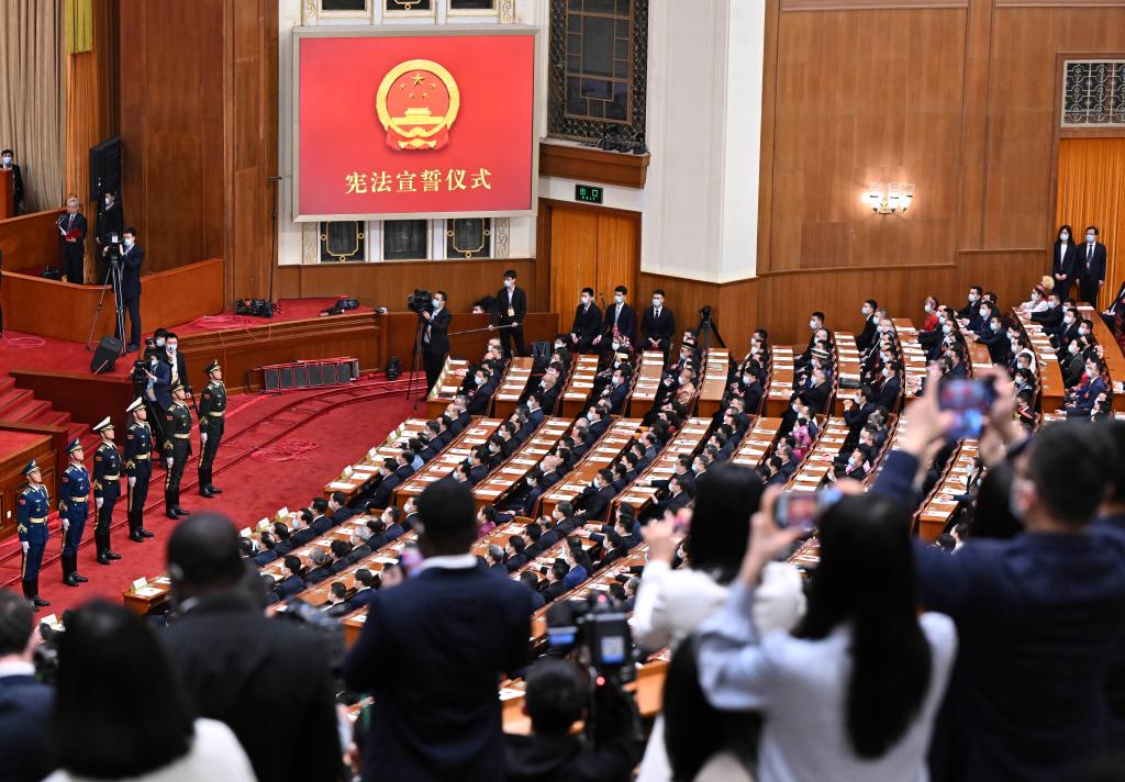 3月10日,十四屆全國人大一次會(huì )議在北京人民大會(huì )堂舉行第三次全體會(huì )議。全體會(huì )議各項議程進(jìn)行完畢后,舉行中華人民共和國第十四屆全國人民代表大會(huì )第一次會(huì )議憲法宣誓儀式。
