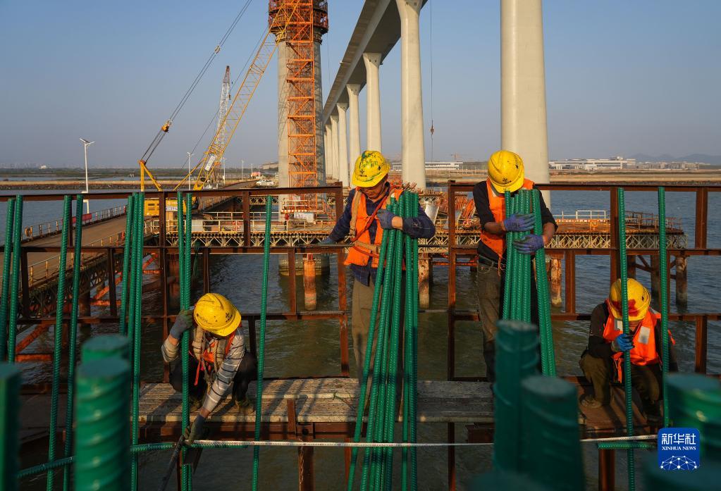 中交路建施工人員在黃茅??绾Mǖ栏邫诟鄞髽蜻M(jìn)行墩柱基樁鋼筋籠綁扎作業(yè)(3月10日攝)。