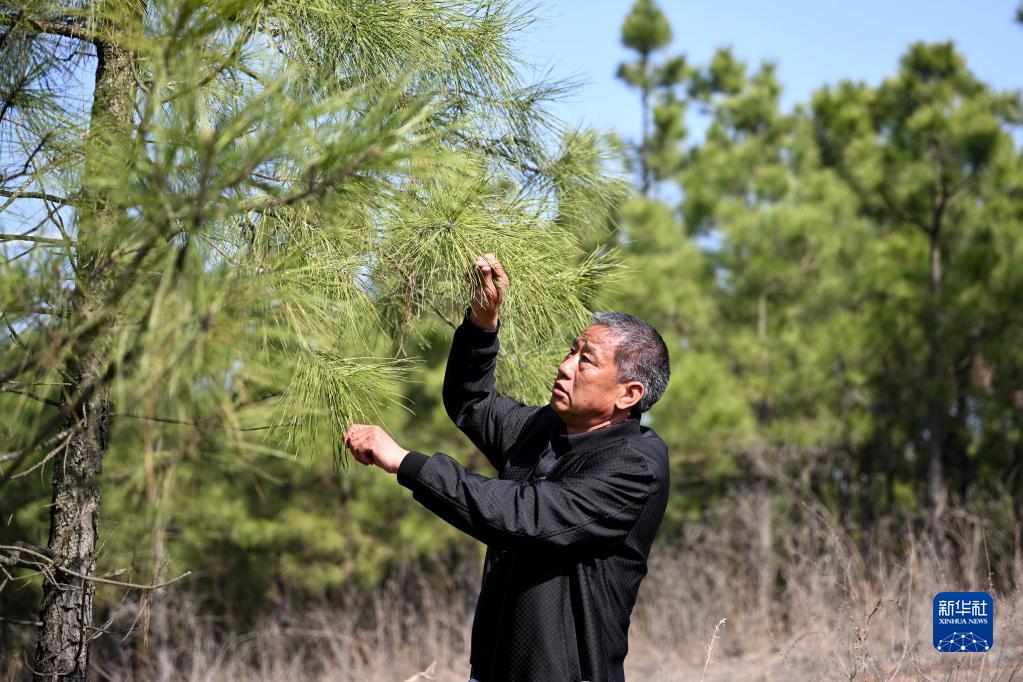 3月10日,在五河縣朱頂鎮陸沖山的山林中,張偉在檢查樹(shù)木的病蟲(chóng)害情況。
