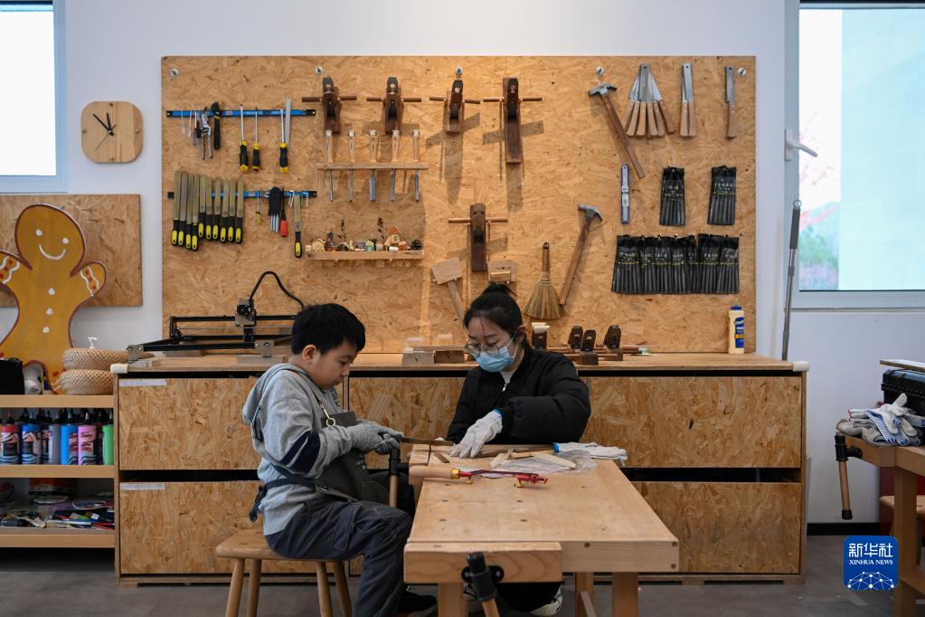 3月11日,在天津市薊州區“eden春山里”生態(tài)教育國際生活示范區木工坊,小朋友在體驗木藝文化。