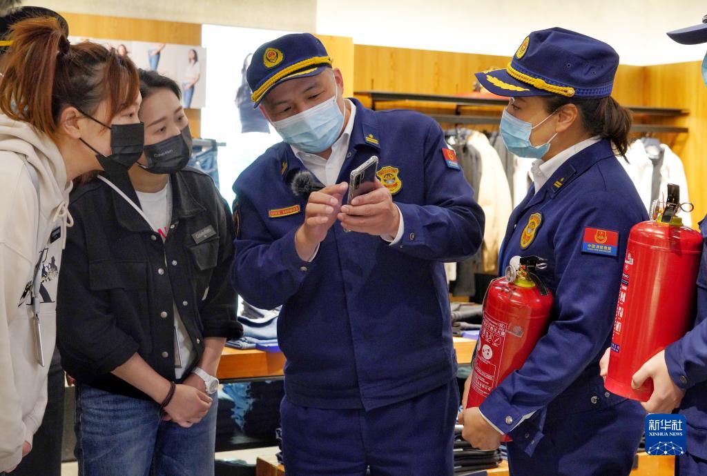 3月14日,消防支隊防火監督員(中)為商場(chǎng)商戶(hù)講解如何使用手機掃碼方式辨別消防產(chǎn)品真偽。