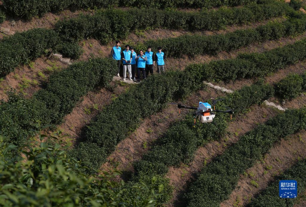 3月14日,在重慶市北碚區天府鎮代家村青峰茶場(chǎng),來(lái)自重慶海聯(lián)職業(yè)技術(shù)學(xué)院無(wú)人機專(zhuān)業(yè)的學(xué)生在練習植保無(wú)人機飛防作業(yè)。