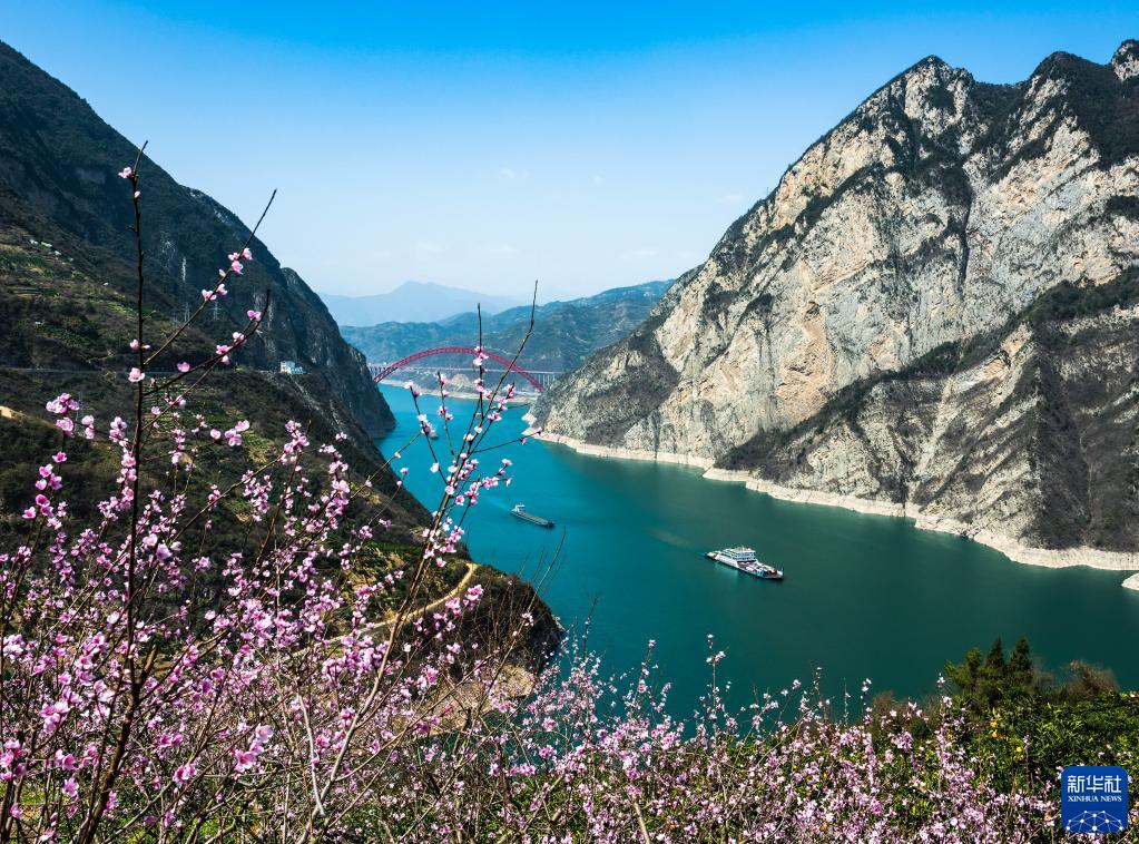3月13日,船舶從三峽庫區宜昌市秭歸縣鏈子巖村桃花盛開(kāi)的臍橙果園前開(kāi)過(guò)。