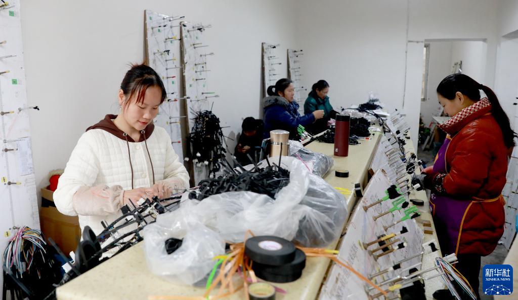 3月14日,四川省華鎣市明月鎮汽車(chē)配件“微車(chē)間”里,女工在纏繞汽車(chē)線(xiàn)束。