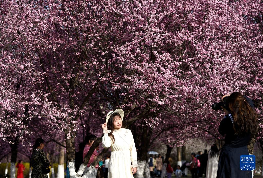 3月14日,游人在西安大明宮國家遺址公園內賞花留影。