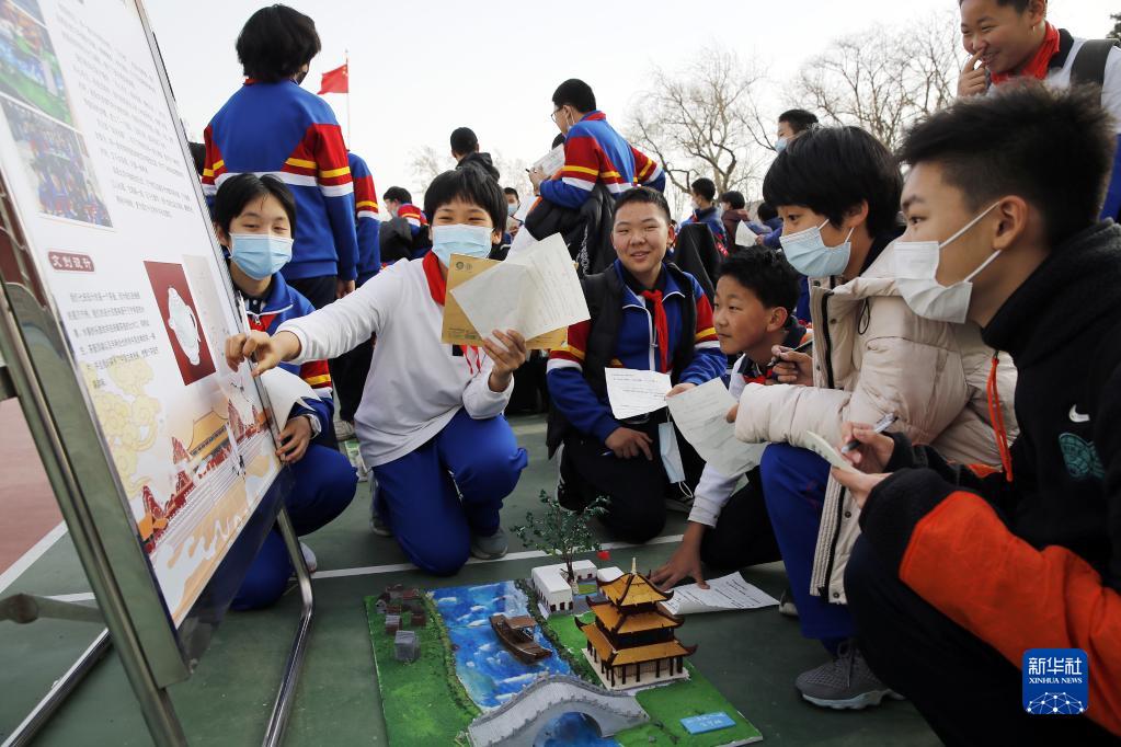 3月14日,中學(xué)生展示參與設計制作的“北京中軸線(xiàn)”景觀(guān)沙盤(pán)作品。