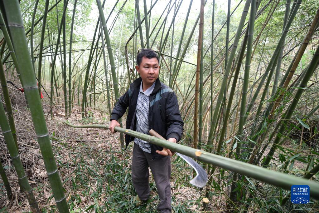 3月15日,在廣西金秀瑤族自治縣忠良鄉巴勒村,村民砍伐竹子準備編織竹編產(chǎn)品。