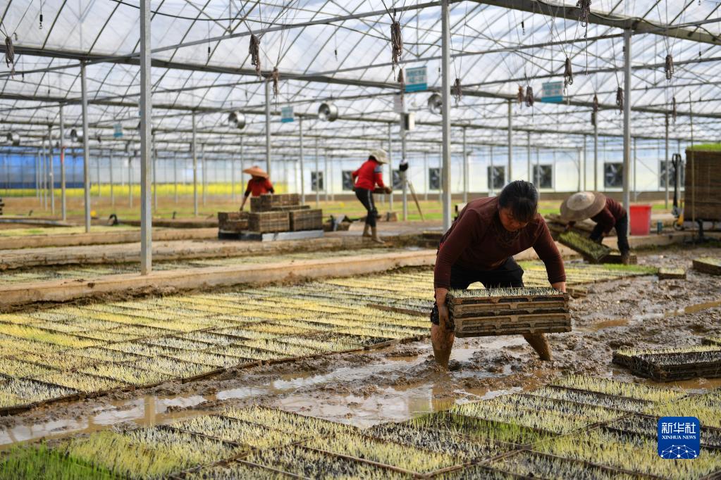 3月15日,農民在向陽(yáng)紅現代農業(yè)智能化集中育秧工廠(chǎng)內放置早稻秧盤(pán)。