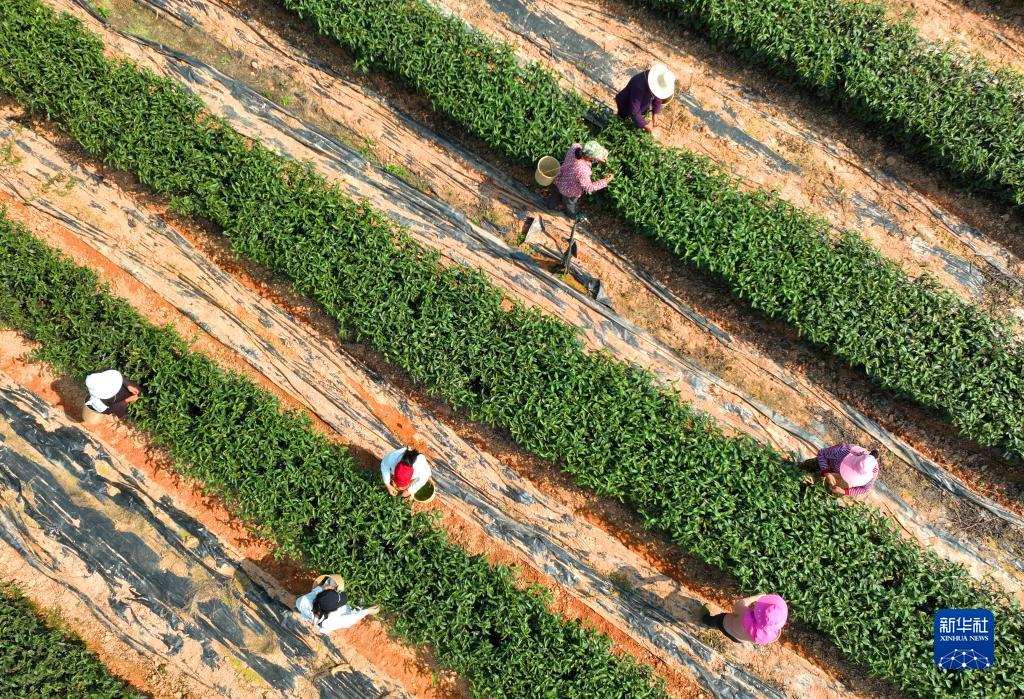 3月15日,在湖南省衡陽(yáng)市衡東縣白蓮鎮小初茶場(chǎng),當地村民在采摘眀前茶(無(wú)人機照片)。