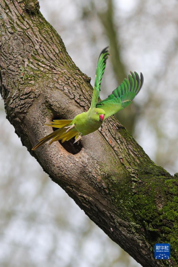 3月15日,一只鸚鵡在比利時(shí)布魯塞爾五十周年紀念公園的林間飛翔。