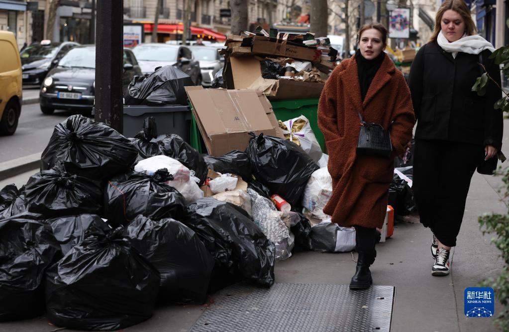 3月15日,人們走過(guò)法國巴黎街頭無(wú)人清理的垃圾。