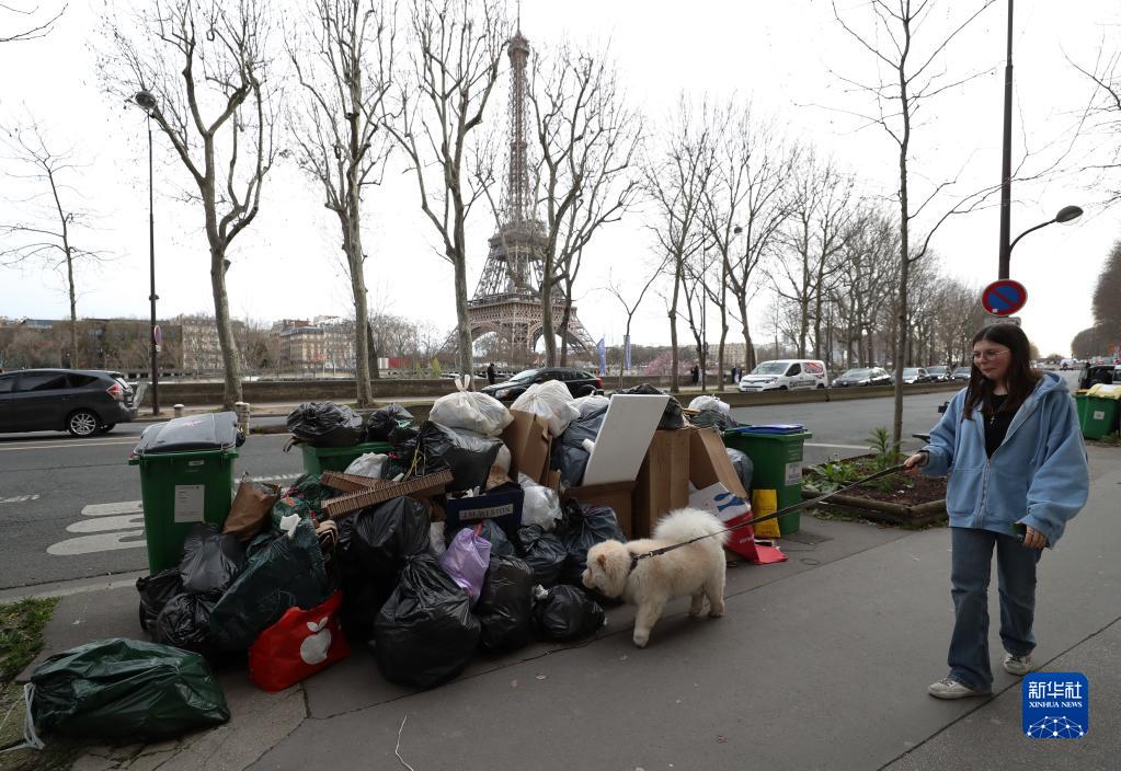 3月15日,一名女子牽狗走過(guò)法國巴黎埃菲爾鐵塔附近無(wú)人清理的垃圾。