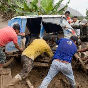 3月15日,在秘魯首都利馬南部的帕查卡馬克區,人們試圖將一輛車(chē)從淤泥中推出。