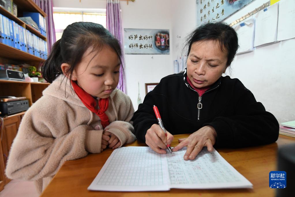廣西金秀瑤族自治縣忠良鄉山界教學(xué)點(diǎn)的教師陶鳳英在辦公室給學(xué)生輔導功課(3月15日攝)。
