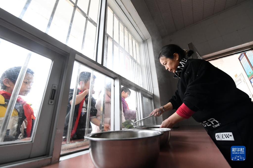 廣西金秀瑤族自治縣忠良鄉山界教學(xué)點(diǎn)的教師陶鳳英給學(xué)生分菜準備吃午飯(3月15日攝)。