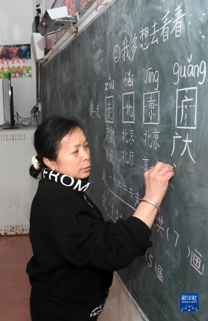 廣西金秀瑤族自治縣忠良鄉山界教學(xué)點(diǎn)的教師陶鳳英給學(xué)生上課(3月15日攝)。
