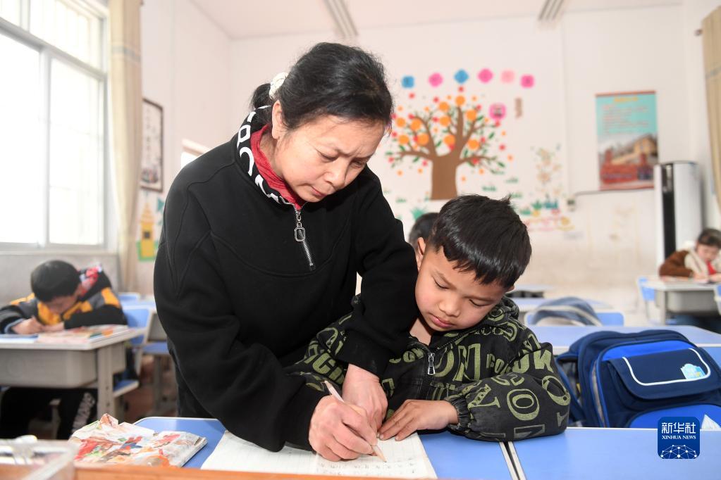 廣西金秀瑤族自治縣忠良鄉山界教學(xué)點(diǎn)的教師陶鳳英教學(xué)生寫(xiě)字(3月15日攝)。