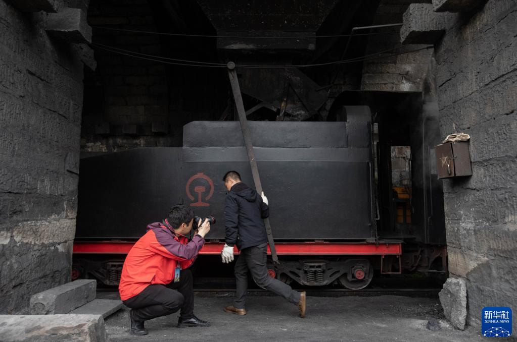 3月15日,“張火癡”拍攝工人給嘉陽(yáng)小火車(chē)加煤。