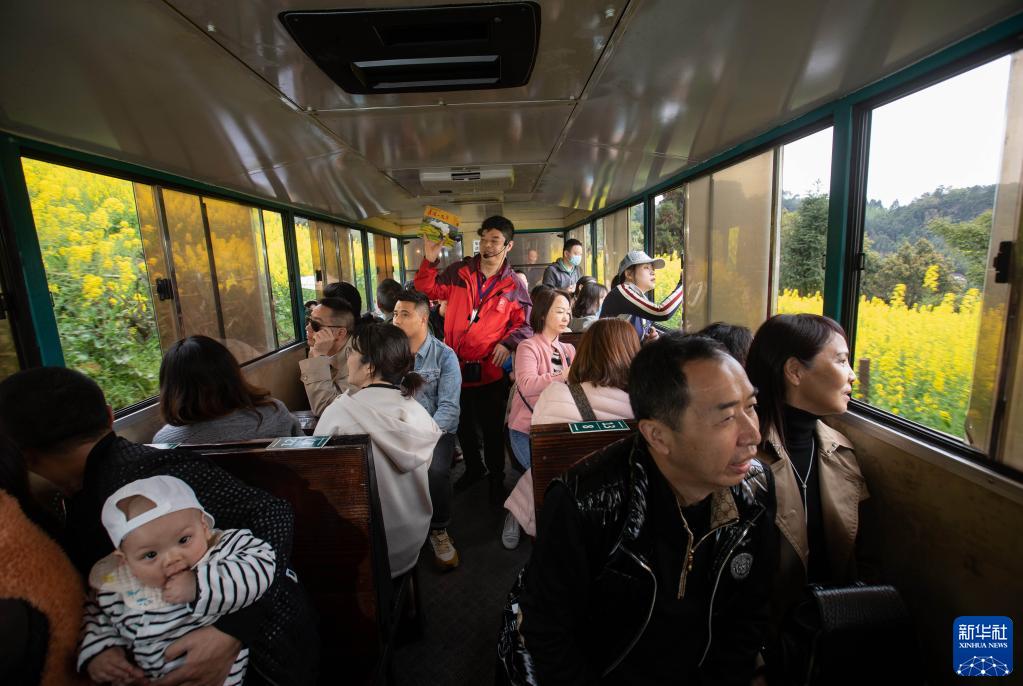 3月15日,“張火癡”(中)在嘉陽(yáng)小火車(chē)上為游客講解。他曾是嘉陽(yáng)小火車(chē)金牌講解員。
