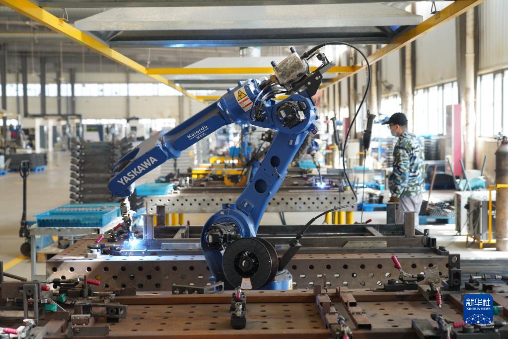 3月15日,在位于樂(lè )亭經(jīng)濟開(kāi)發(fā)區的北京京東科技(樂(lè )亭)有限公司,機械手臂在進(jìn)行焊接作業(yè)。