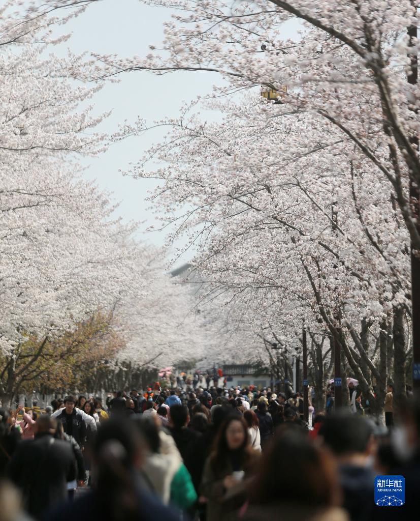 3月16日,游客在江蘇省揚州市鑒真路的“櫻花大道”游玩。