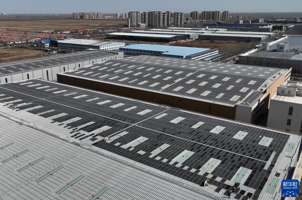 3月16日,工人在唐山市蘆臺經(jīng)濟開(kāi)發(fā)區一家企業(yè)廠(chǎng)房屋頂上安裝太陽(yáng)能光伏發(fā)電板(無(wú)人機照片)。